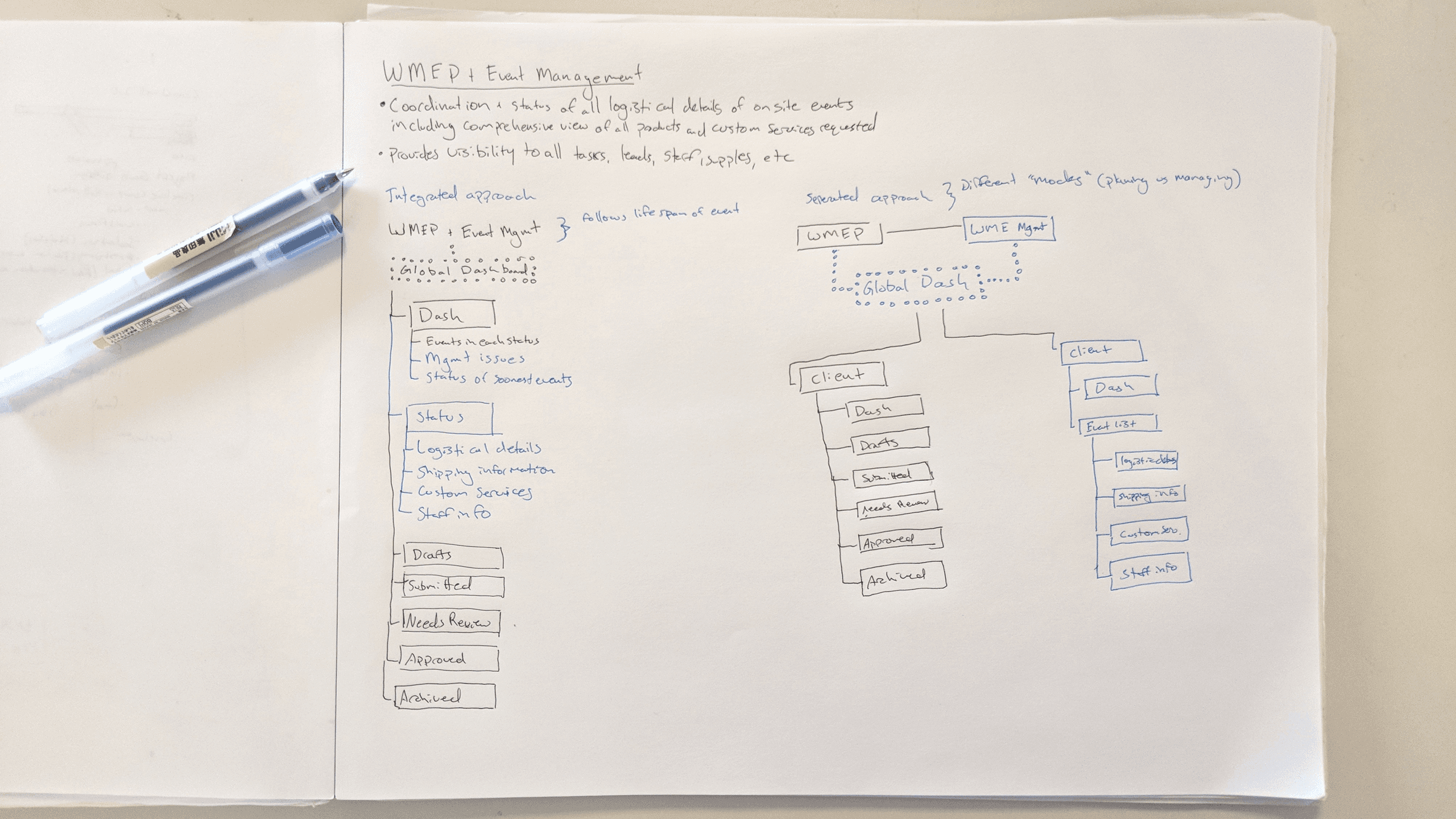 I understood what the approval workflow looked like, but did not understand how it would fit into the rest of the system. To work through creating this, I paired low fidelity wireframes with user flows for client and event manager tasks.