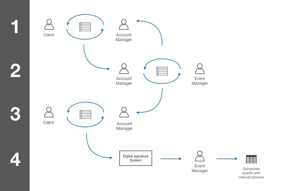 The old workflow had clients submitting event requests on a complicated, messy Excel sheet to their Account Manager, and they would email back and forth, then pass off to an event manager and… it was inefficient. With hundreds of events a month, the sheer volume of work, errors, and frustrations compiled.