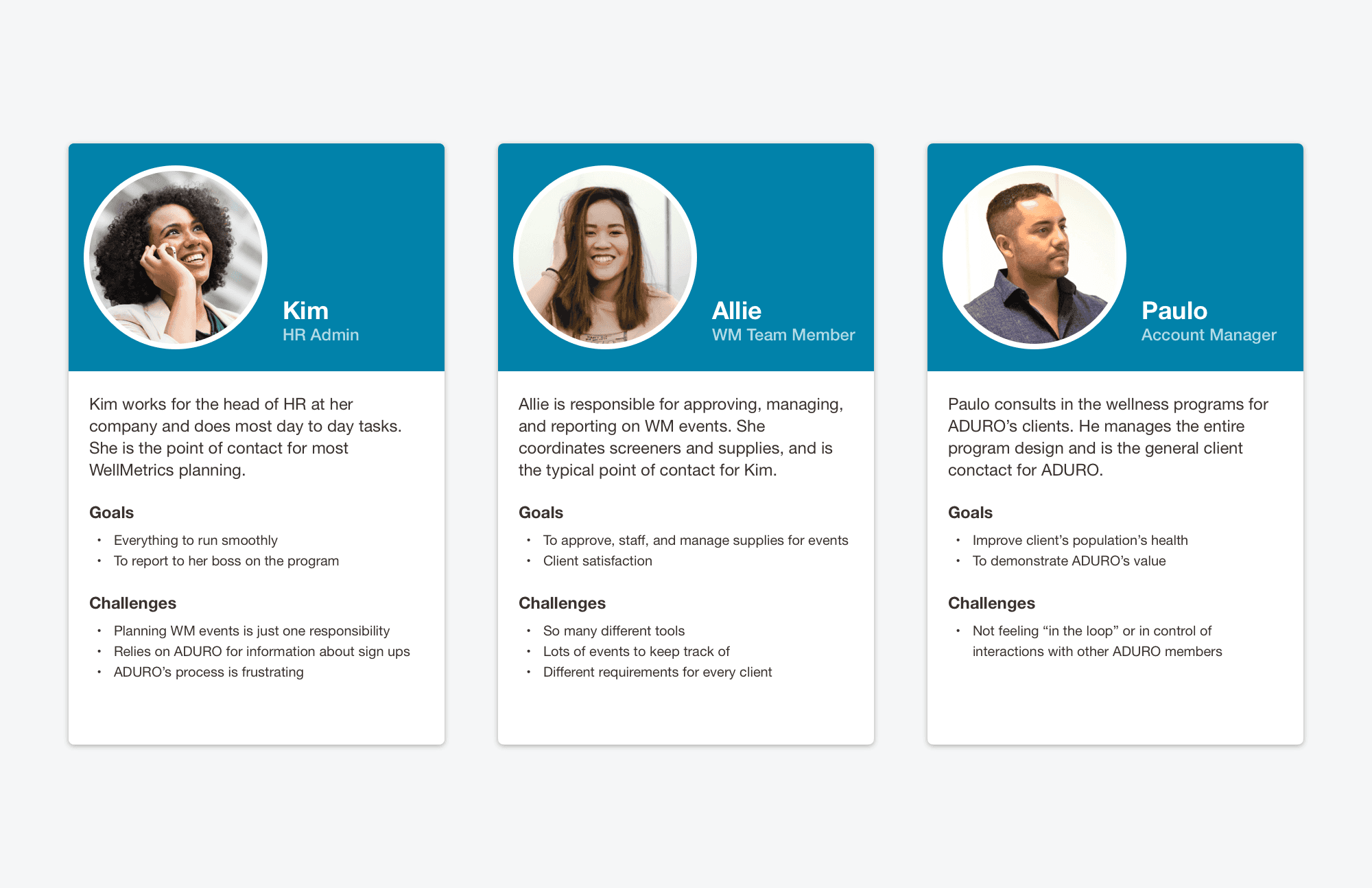 The first step was understanding the currently process, identify stakeholders and responsibilities: Clients, Account Managers and Wellmetrics Event Managers.